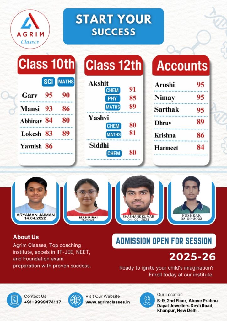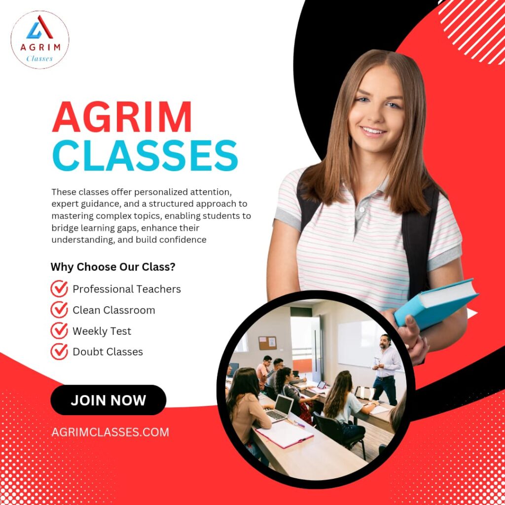 Welcome to Agrim Classes, where we redefine excellence in academic coaching. Our commitment is to sculpt the future leaders of tomorrow by providing unparalleled guidance for competitive exams such as IIT-JEE , NEET and other medicals institutions, alongside a strong foundation in CBSE curriculum from classes 9th to 12th.At Agrim Classes, we believe that every student possesses the potential to achieve greatness, and it’s our mission to unlock that potential through the perfect blend of instruction and mentorship. Our class schedules are meticulously crafted to cater to the unique needs of each student, ensuring optimal learning and growth.Our curriculum is designed not only to impart theoretical knowledge but also to foster critical thinking and scientific acumen among our students. We understand that learning is a lifelong journey, and we instill in our students the thirst for knowledge that will propel them towards success in any endeavor they pursue.Our team of faculty members comprises seasoned industry experts who bring a wealth of experience and expertise to the classroom. With their guidance and mentorship, students are empowered to conquer challenges and emerge as champions in their respective fields.At Agrim Classes, we foster a culture of collaboration and inquiry, where students are encouraged to voice their doubts and engage in one-on-one sessions with our faculty members. We believe that this personalized approach is key to nurturing the intellectual curiosity and competitive spirit that define our students.